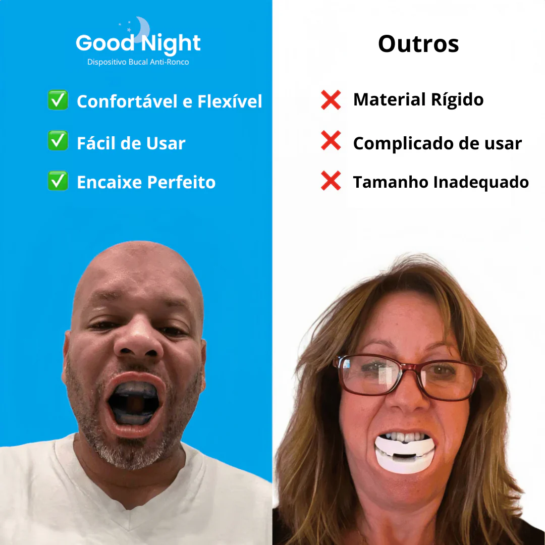 Você acorda cansado, com dor de cabeça ou alguém já reclamou do seu ronco? O Good Night Protetor Bucal Anti-Ronco foi desenvolvido para eliminar o ronco e aliviar sintomas da apneia leve e moderada.